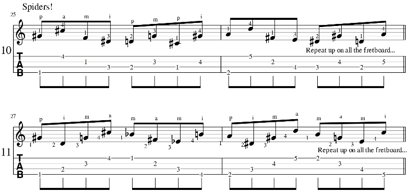 Now that we have warmed the fingers, we execute two short sequences focused to develop coordination between the two hands, the famous ‘spiders’: