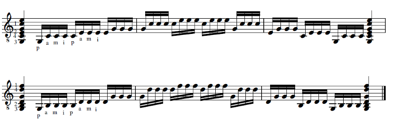 Basically it’s made playing a bass note with the thumb followed by three repeated higher notes, traditionally plucked with the ring (a), middle (m), and index (i) fingers. play the higher notes.