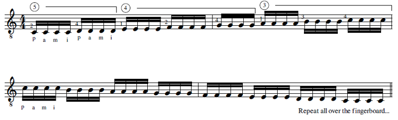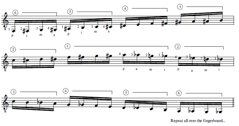 One of my personal exercises is to perform a chromatic scale by applying the tremolo technique, straight and ‘inverted’:
