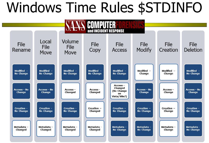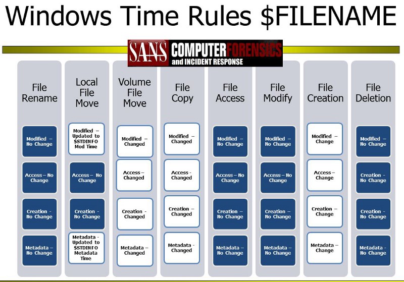 Each operation alters different metadata, here a table of time rules related to $STANDARD_INFORMATION: