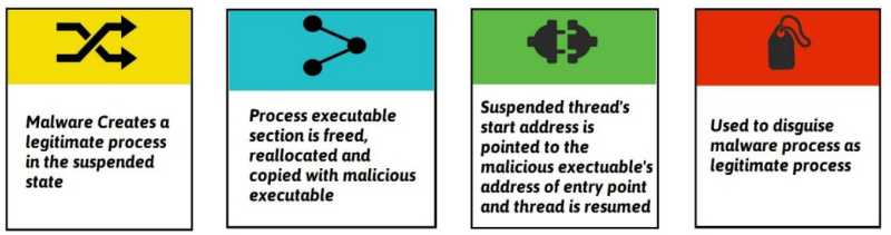 Basically, when a malware starts, it will pick a victim among the Windows processes (like explorer.exe) and start a new instance of it, in a suspended state. In that state it’s safe to modify and the malware will totally clear it from its code, extend the memory if needed, and copy its own code inside.