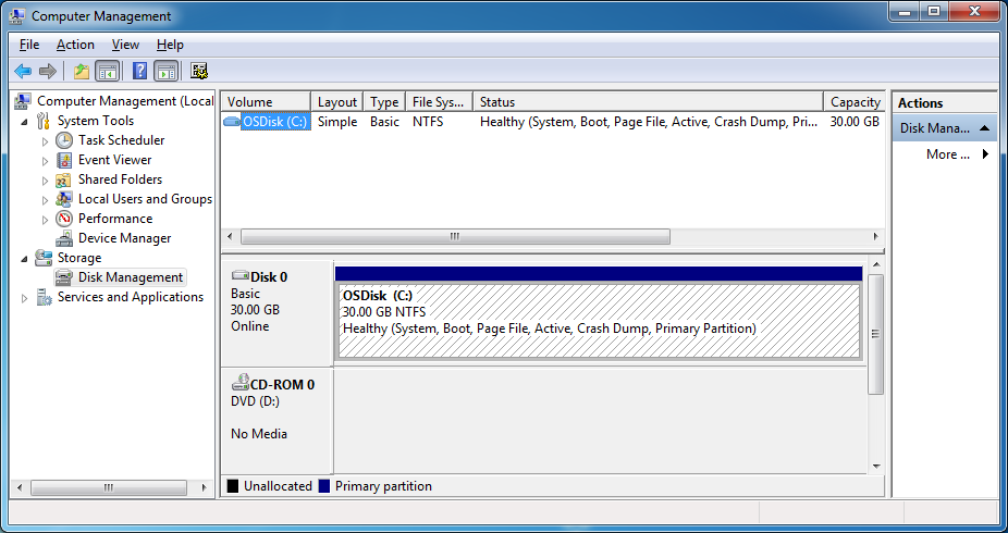 - Identify and take notes on the volumes that are currently mounted on the system through the Computer Management console (Start -> right-click on Computer -> Manage). Navigate into ‘Disk Management’.