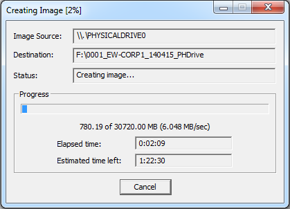 - Click on Start and record the time in your notes. The progress of the imaging process will be displayed as well as the elapsed and remaining time.