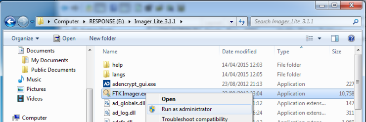 - Run FTK Imager.exe as an administrator (right click -> Run as administrator).