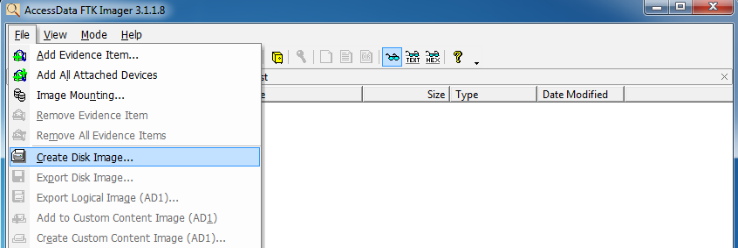 - In FTK’s main window, go to File and click on Create Disk Image.