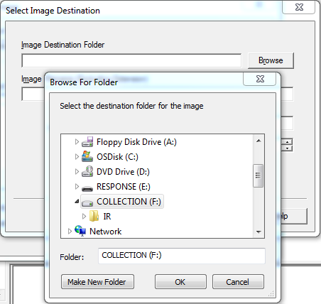 - In the Image Destination Folder browse for the external collection drive (if different from the response drive) and click OK.