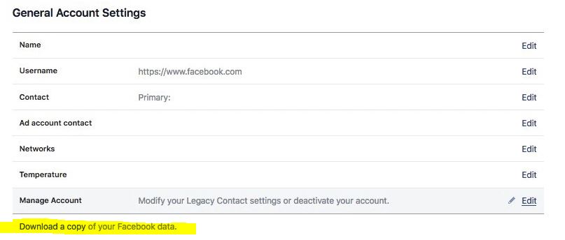 Right below Manage Account in the Settings menu there’s a Download a copy of your Facebook data option.