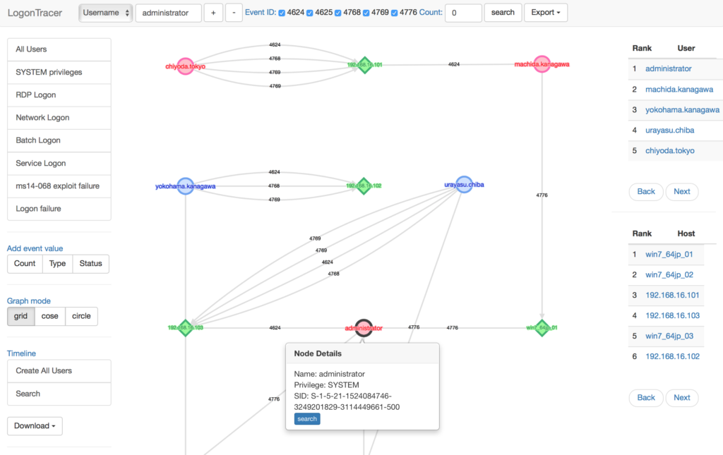 LogonTracer also allows to display display event logs ordered by a chronological order or by a ranking, which is calculated performing network analysis on the event log graph, and creates a ranking based on the “centrality” of each node, an index which indicates each node’s proximity to the centre in a network.