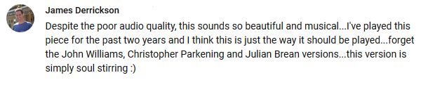 Despite the poor audio quality, this sounds so beautiful and musical...I've played this piece for the past two years and I think this is just the way it should be played...forget the John Williams, Christopher Parkening and Julian Brean versions...this version is simply soul stirring