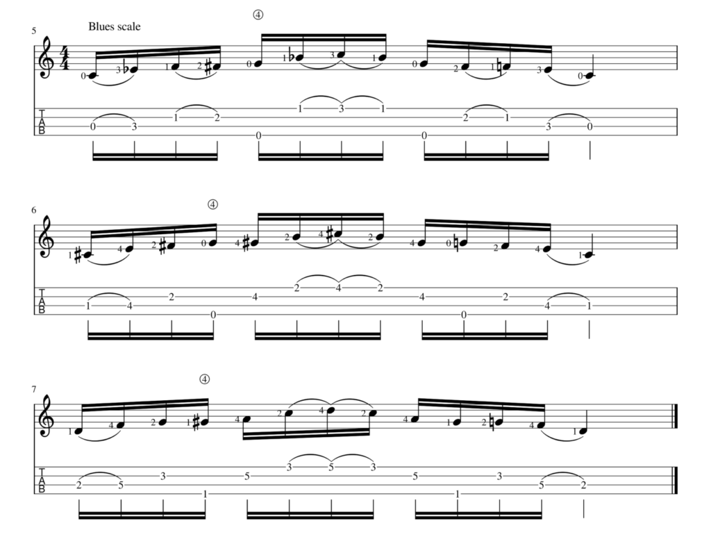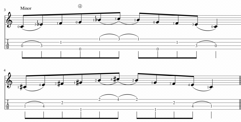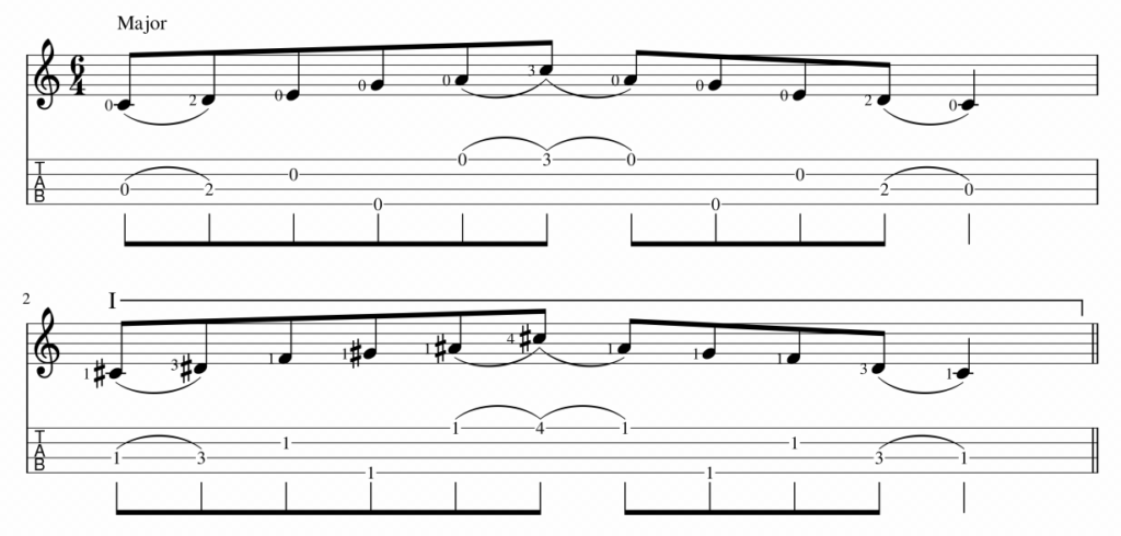 Two patterns: the first uses free strings, and can be used in the first position, the second can be shift on the entire fretboard.