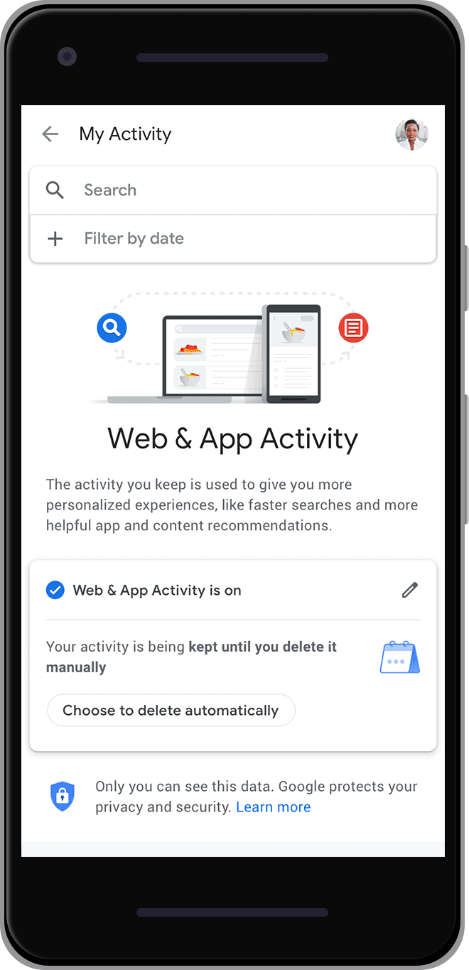 Whether you’re looking for the latest news or the quickest driving route, we aim to make our products helpful for everyone. And when you turn on settings like Location History or Web & App Activity, the data can make Google products more useful for you—like recommending a restaurant that you might enjoy, or helping you pick up where you left off on a previous search. We work to keep your data private and secure, and we’ve heard your feedback that we need to provide simpler ways for you to manage or delete it.