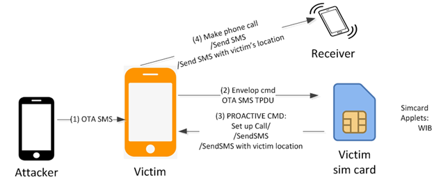 (1) Attacker sends a malicious OTA SMS to the victim phone number. The OTA SMS contains WIB command such as: SETUP CALL, SEND SMS, PROVIDE LOCATION INFO, etc.
