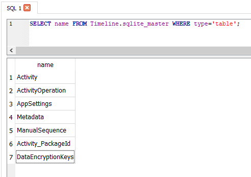 “ActivitiesCache.db” is a SQLite (viewable with any SQLite browser) database containing 7 tables: