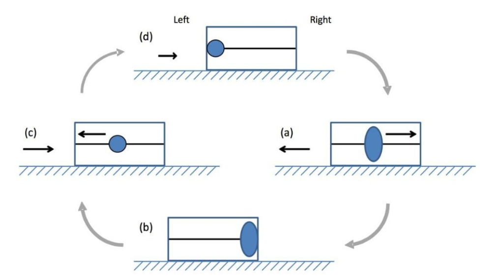 …picture a box on a frictionless surface. Inside that box is a rod, along which a ring can slide. If a spring inside the box gives the ring a push, the ring will slide along the rod one way while the box will recoil in the other. When the ring reaches the end of the box, it will bounce backwards, and the box’s recoil direction will switch too. This is action-reaction – also known as Newton’s third law of motion – and in normal circumstances, it restricts the box to wiggling back and forth