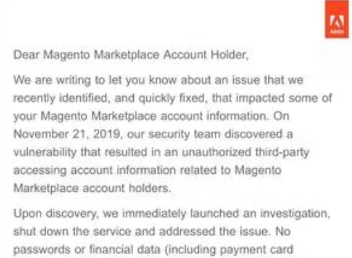 Adobe disclosed a security breach that affected the users of the Magento Marketplace portal, the security team discovered the incident on November 21. The Magento Marketplace is a website for buying and downloading themes and plugins for e-stores running the Magento CMS.