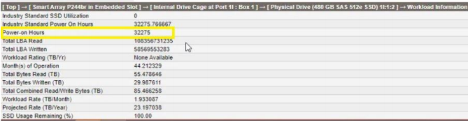 You can follow these HPE instructions [2] to find out how many hours of operation a SSD has collected: