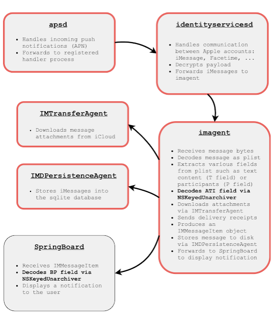 Incoming iMessages pass through multiple services and frameworks before a notification is finally displayed to the user and the message is written to the messages database. The main services handling iMessages on iOS 12.4 without requiring user interaction are depicted below. A red border indicates the existence of a sandbox for the process.