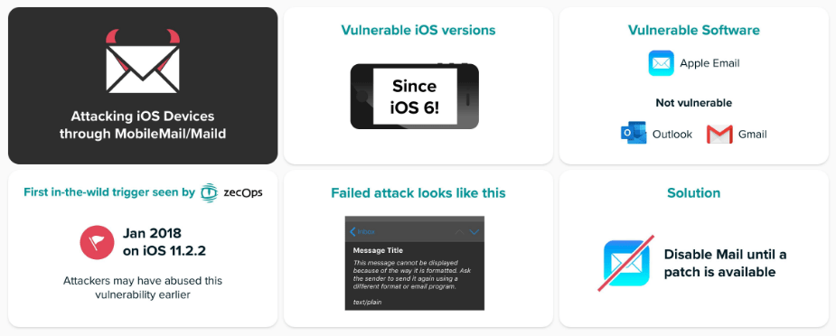 Accordint to ZecOps report, all stock Mail.app versions on iPhones and iPad iOS 6 or above, including the latest version iOS 13.4., are vulnerable to attacks.