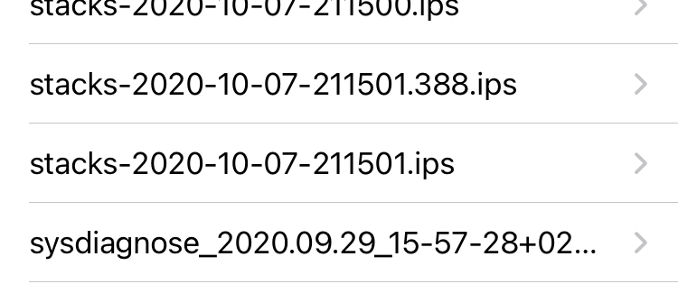 The file name will be similar to “sysdiagnose_2020.09.29_15-57-28+0200_iPhone_OS_iPhone_18A373.tar.gz”, indicating the date and time the sysdiagnose was generated, the device type (iPhone) and the iOS installed version (18A373 = iOS 14.0).